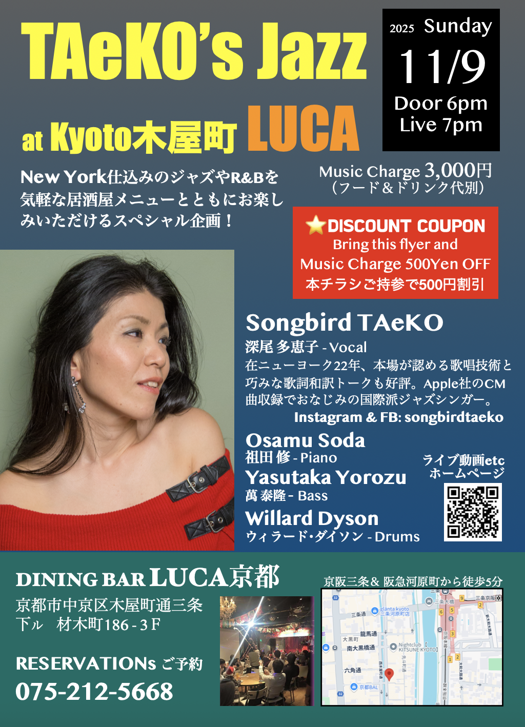 11月9日(日) 18:00 京都・木屋町 DINING BAR LUCA